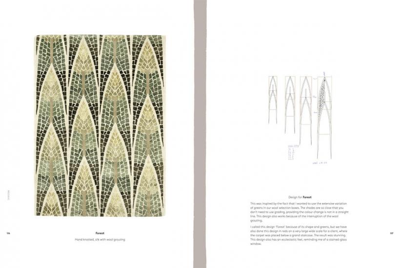 The book describes her journey from figurative painting into carpet design and carefully explains the thoughts, questions and challenges that occurred along the way, and the techniques required to support them.