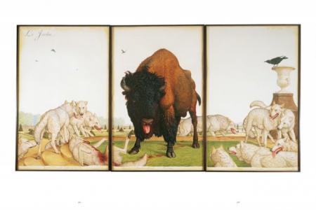 At first glance, Walton Ford’s large-scale, highly-detailed watercolors of animals may recall the prints of 19th century illustrators John James Audubon and Edward Lear, and others of the colonial era. But a closer look reveals a complex and disturbingly anthropomorphic universe, full of symbols, sly jokes, and allusions to the 'operatic' nature of traditional natural history themes. The beasts and birds populating this contemporary artist's life-size paintings are never mere objects, but dynamic actors in allegorical struggles: a wild turkey crushes a small parrot in its claw; a troupe of monkeys wreak havoc on a formal dinner table, an American buffalo is surrounded by bloodied white wolves. The book's title derives from The Pancha Tantra, an ancient Indian book of animal tales considered the precursor to Aesop’s Fables.